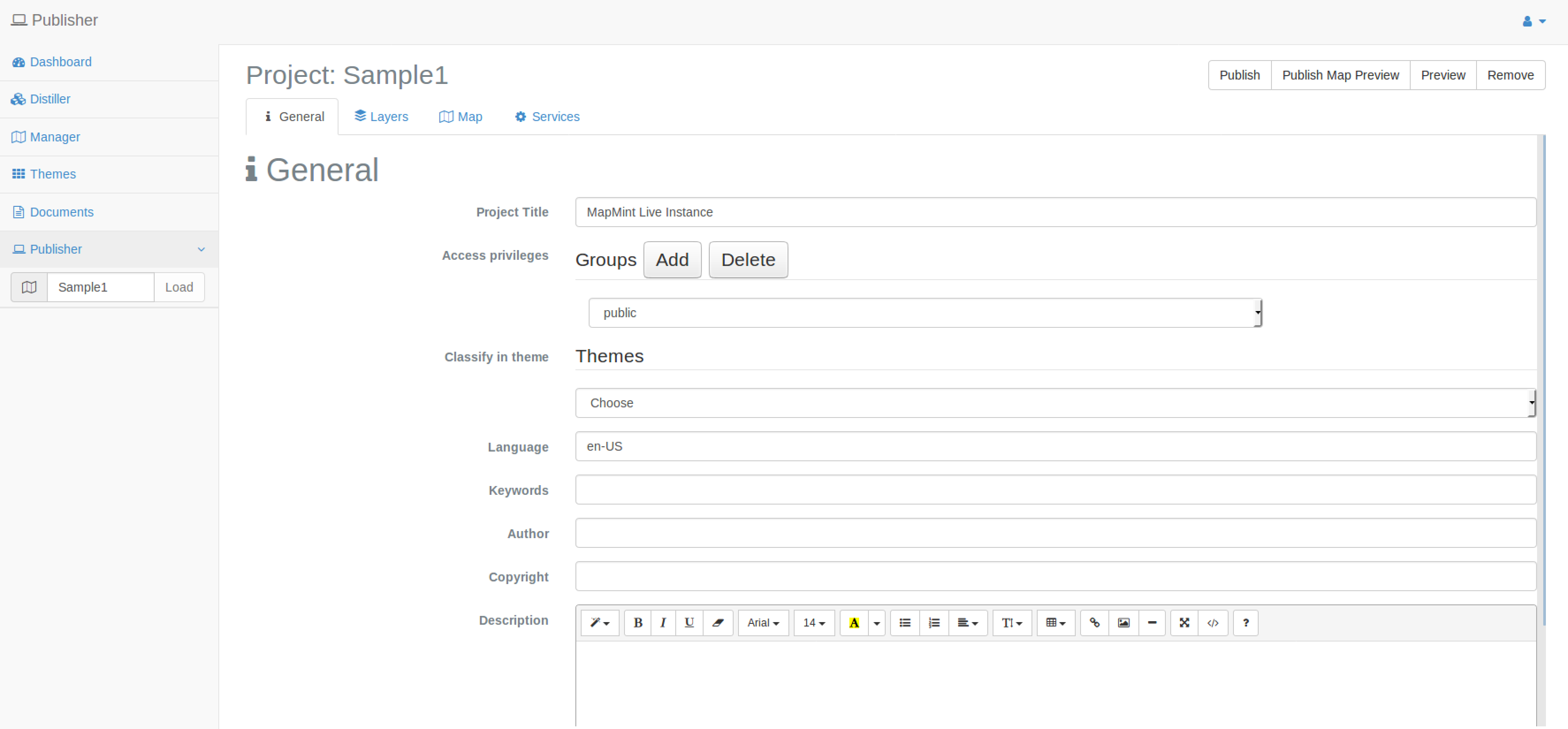 The Publisher is a module made to publish your web application. It comprises of two panels: on the left, the maps list and, on the right, the configuration tabs.